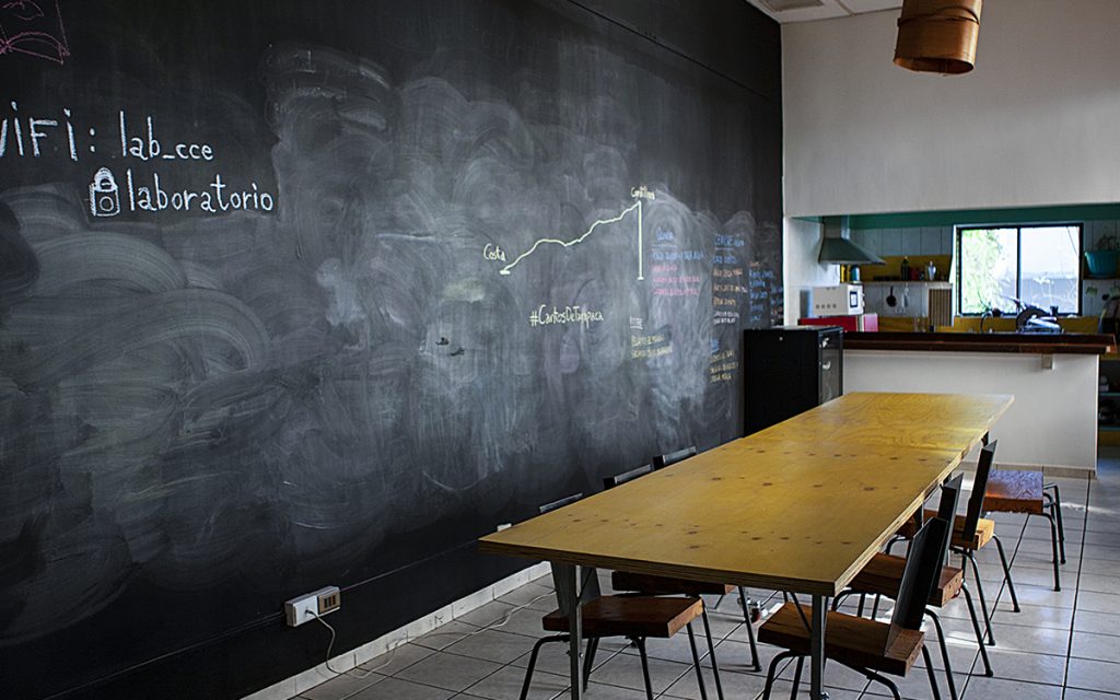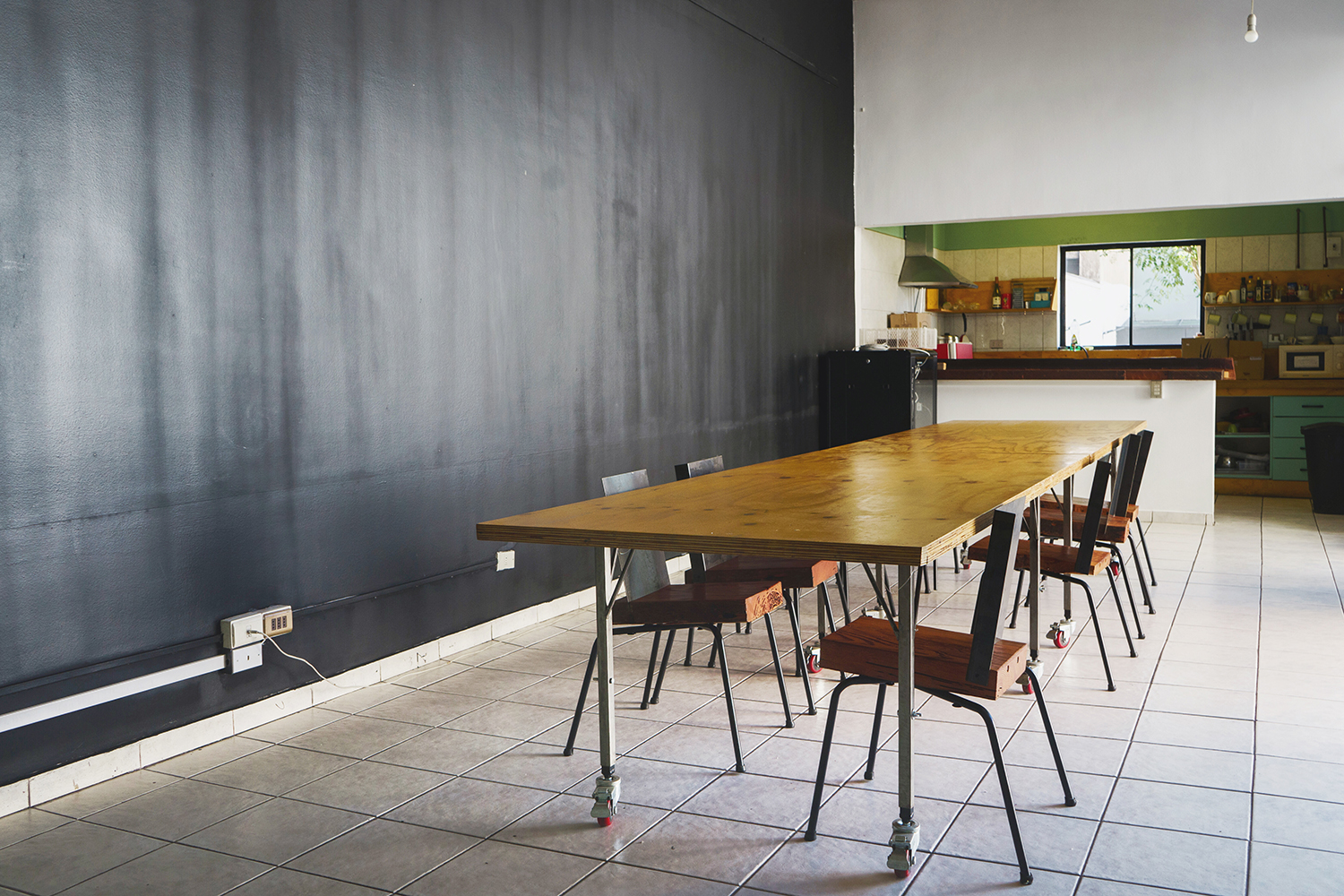 Este espacio está compuesto por una sala de trabajo con capacidad para 30 personas, equipado con mesas, sillas y una enorme pizarra, una cocina y acceso directo a nuestro patio.